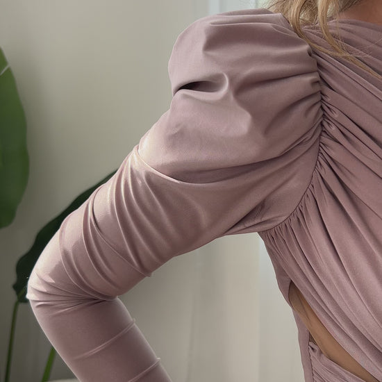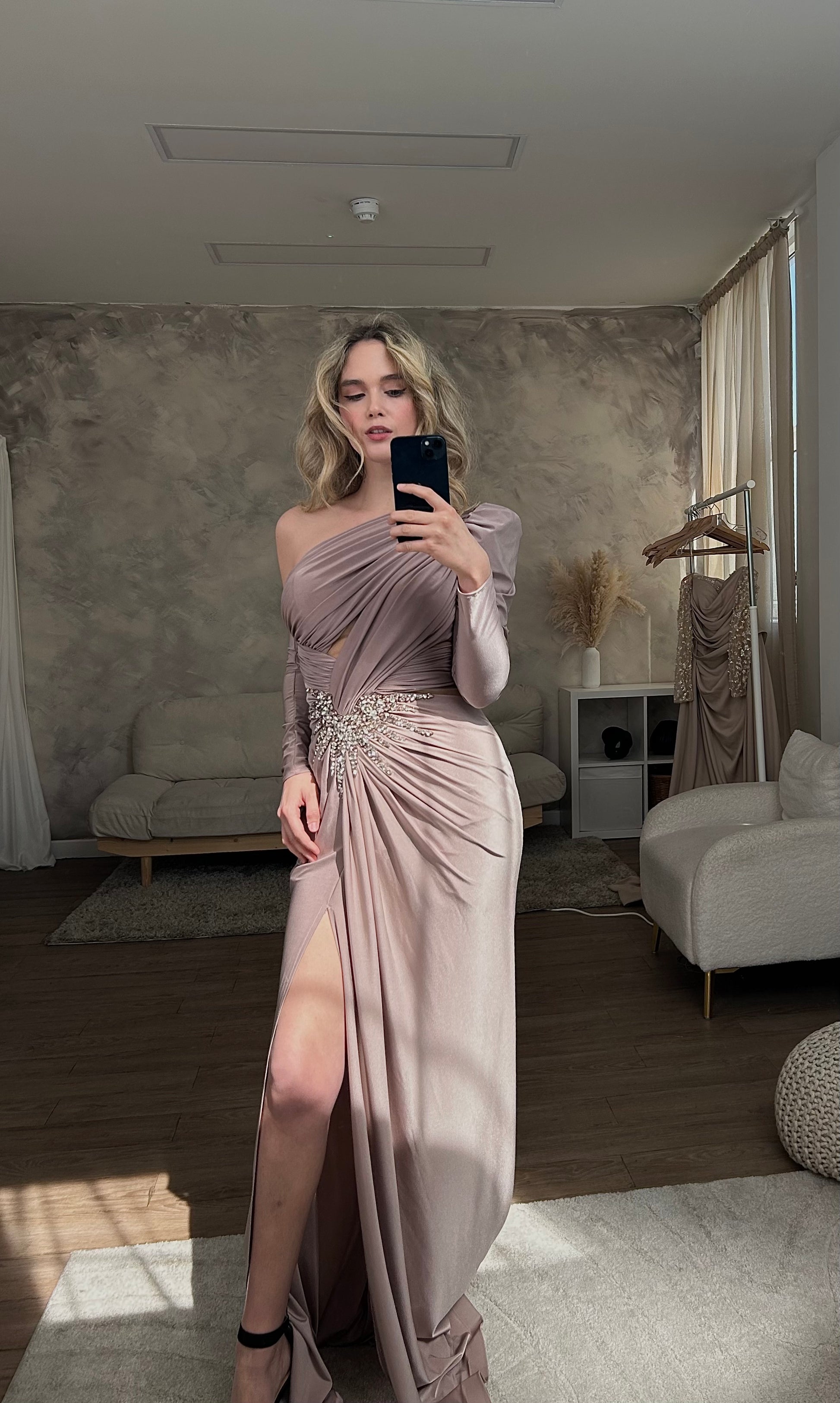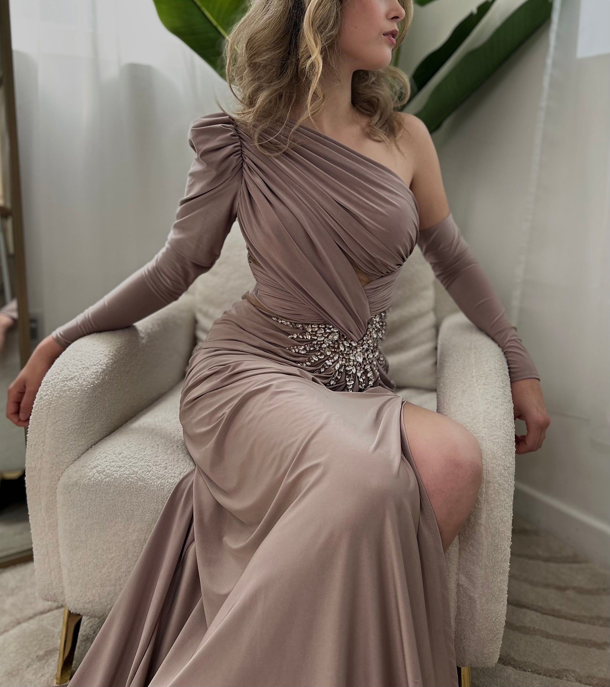 Malika is an opulent evening gown that commands attention. Featuring intricate crystal embellishments reminiscent of a crown, this floor-length masterpiece embodies pure luxury and queen-like grace.