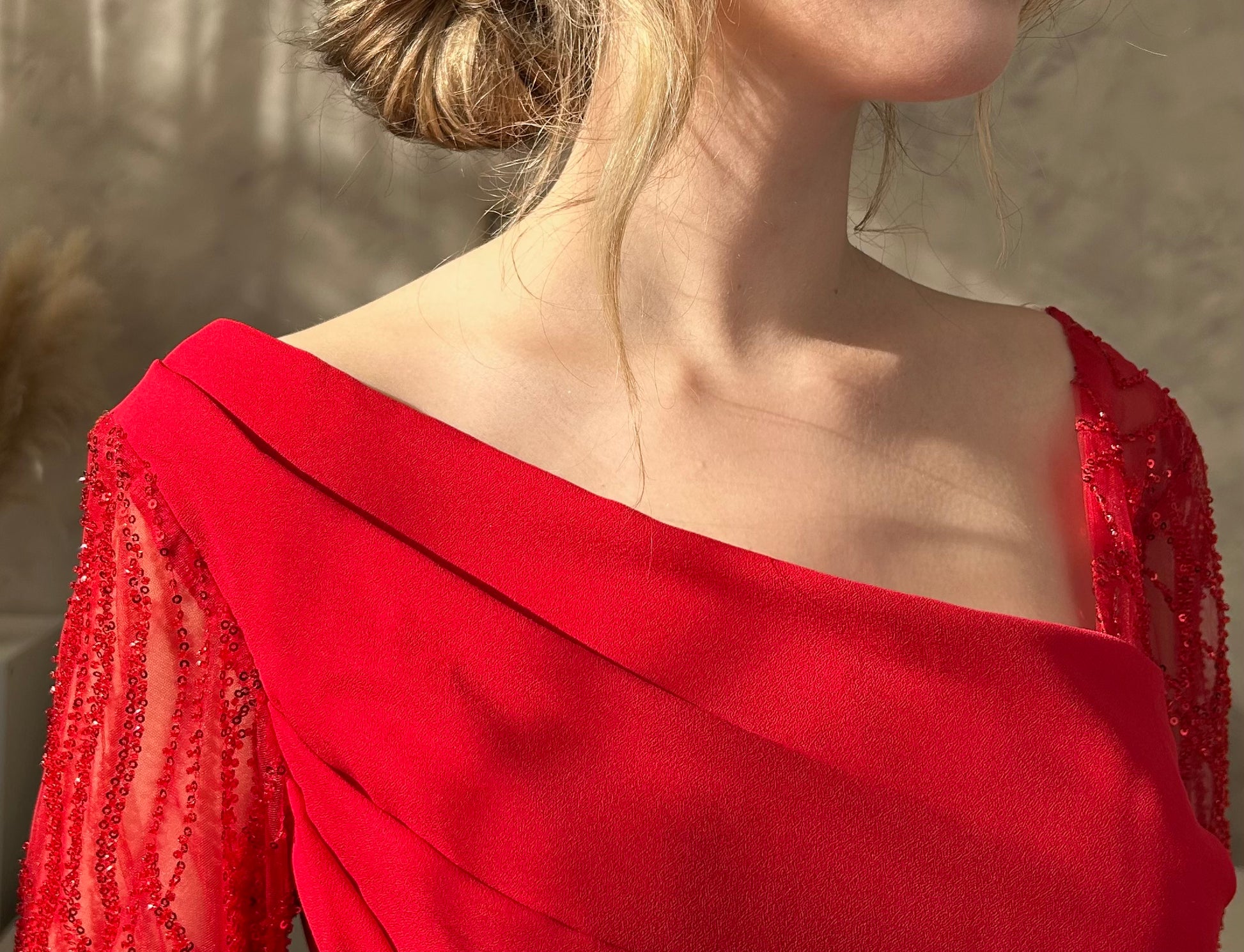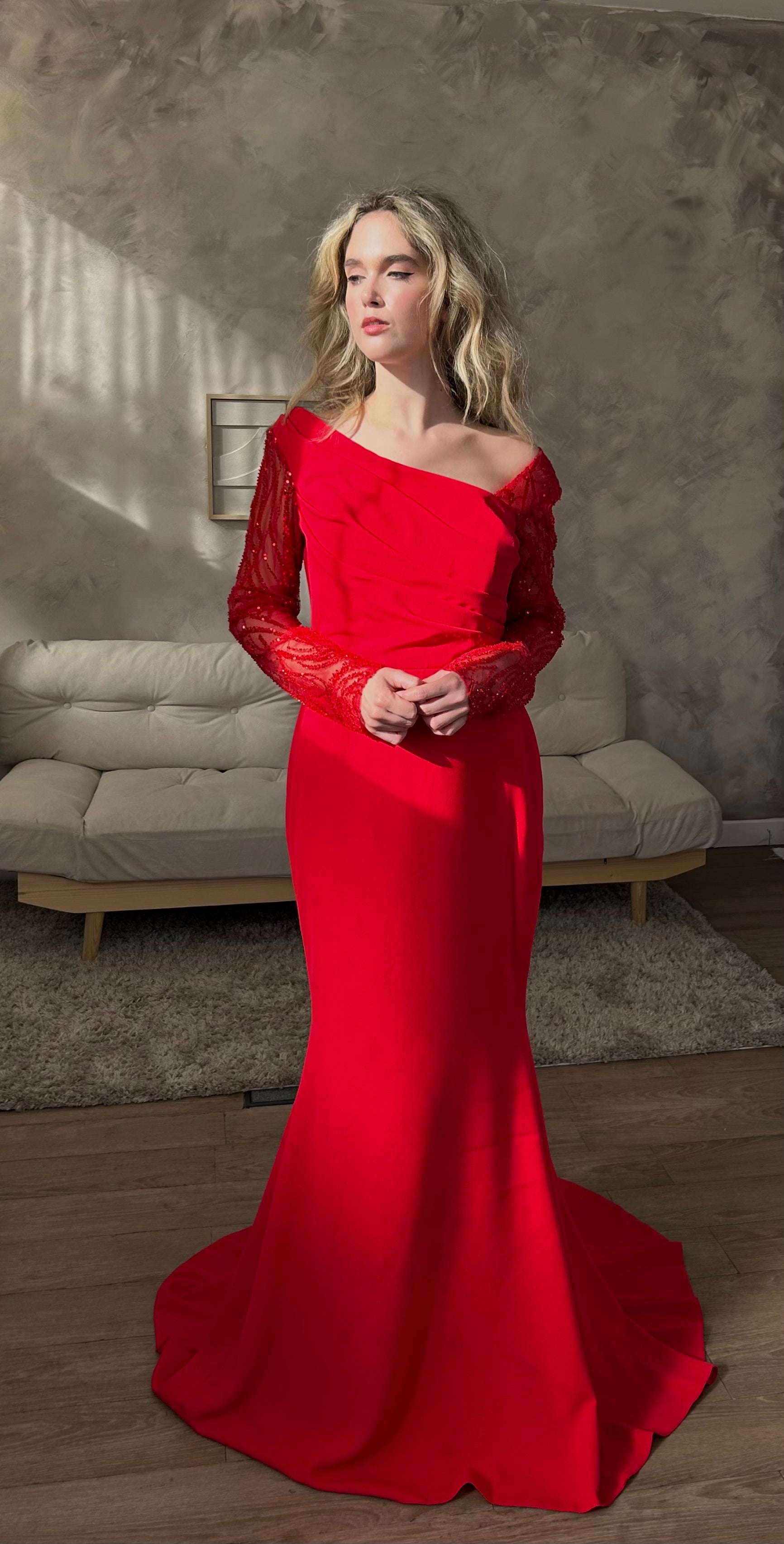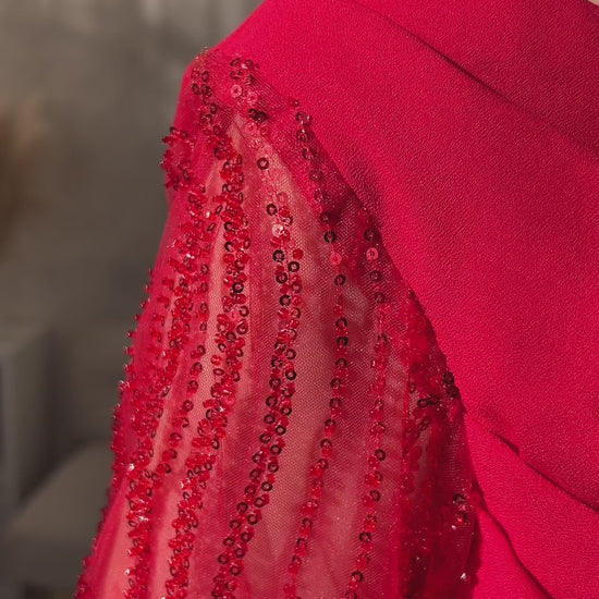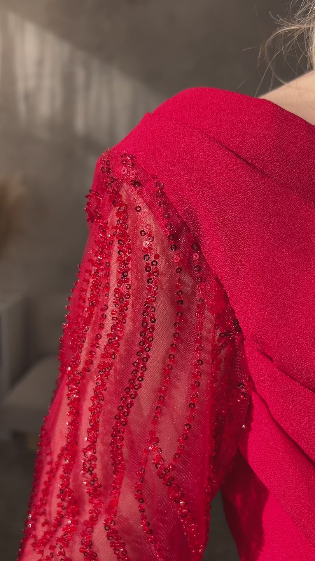 Fierce and feminine, Rose stuns in bold red. Its flowing train turns every step into a statement, while the sequin-dusted sleeves add just the right amount of sparkle. Drama, meets elegance.