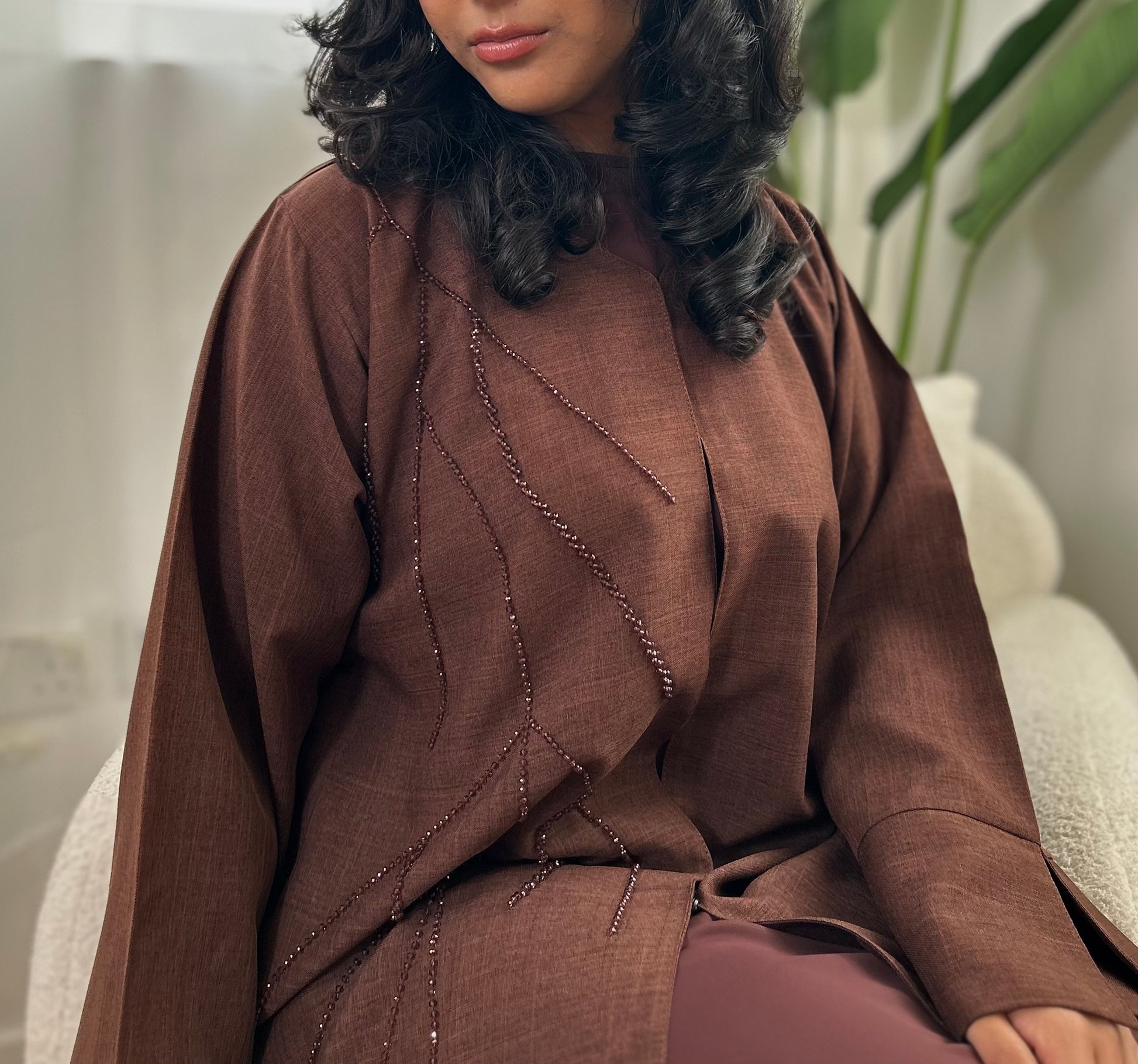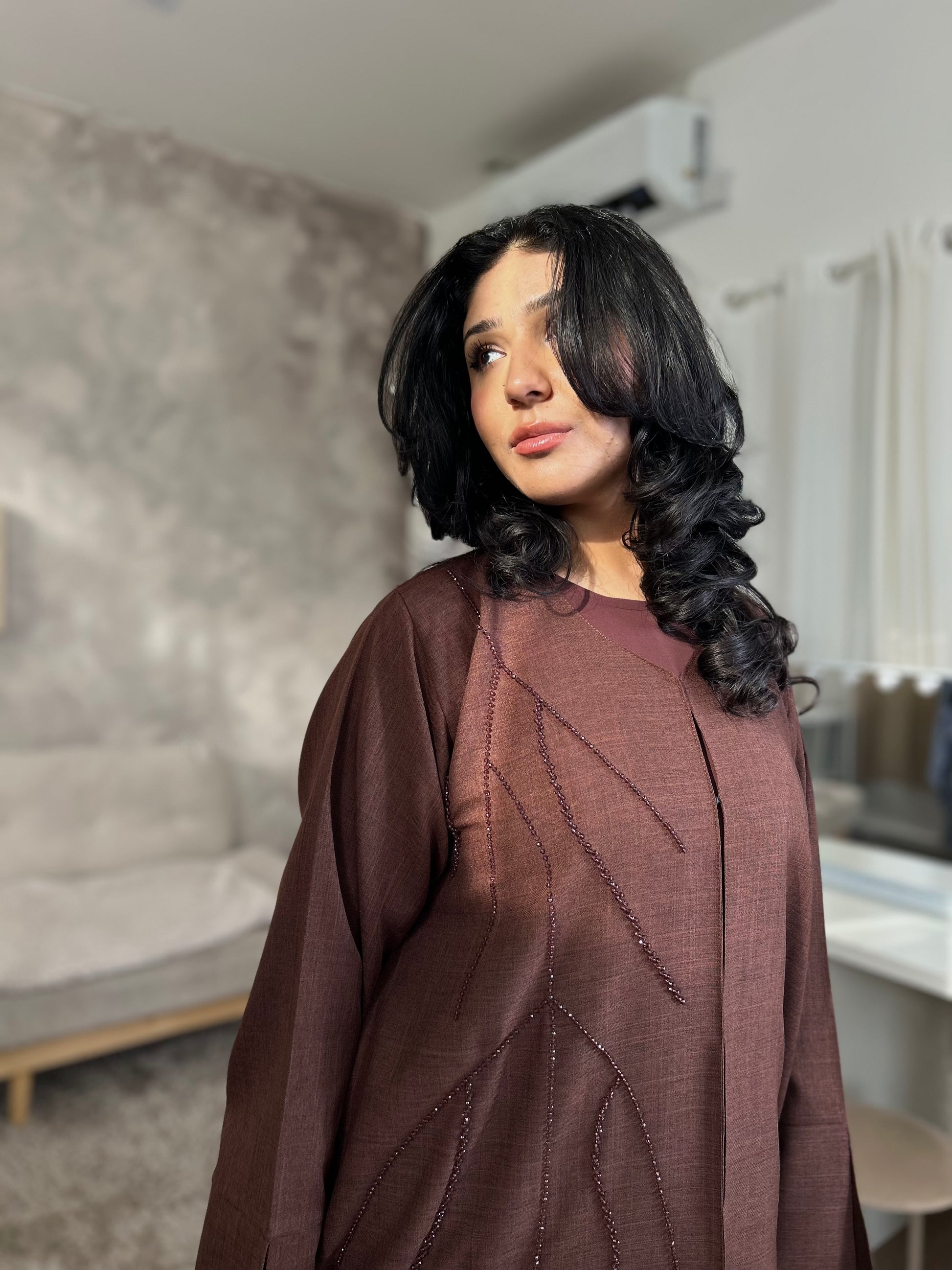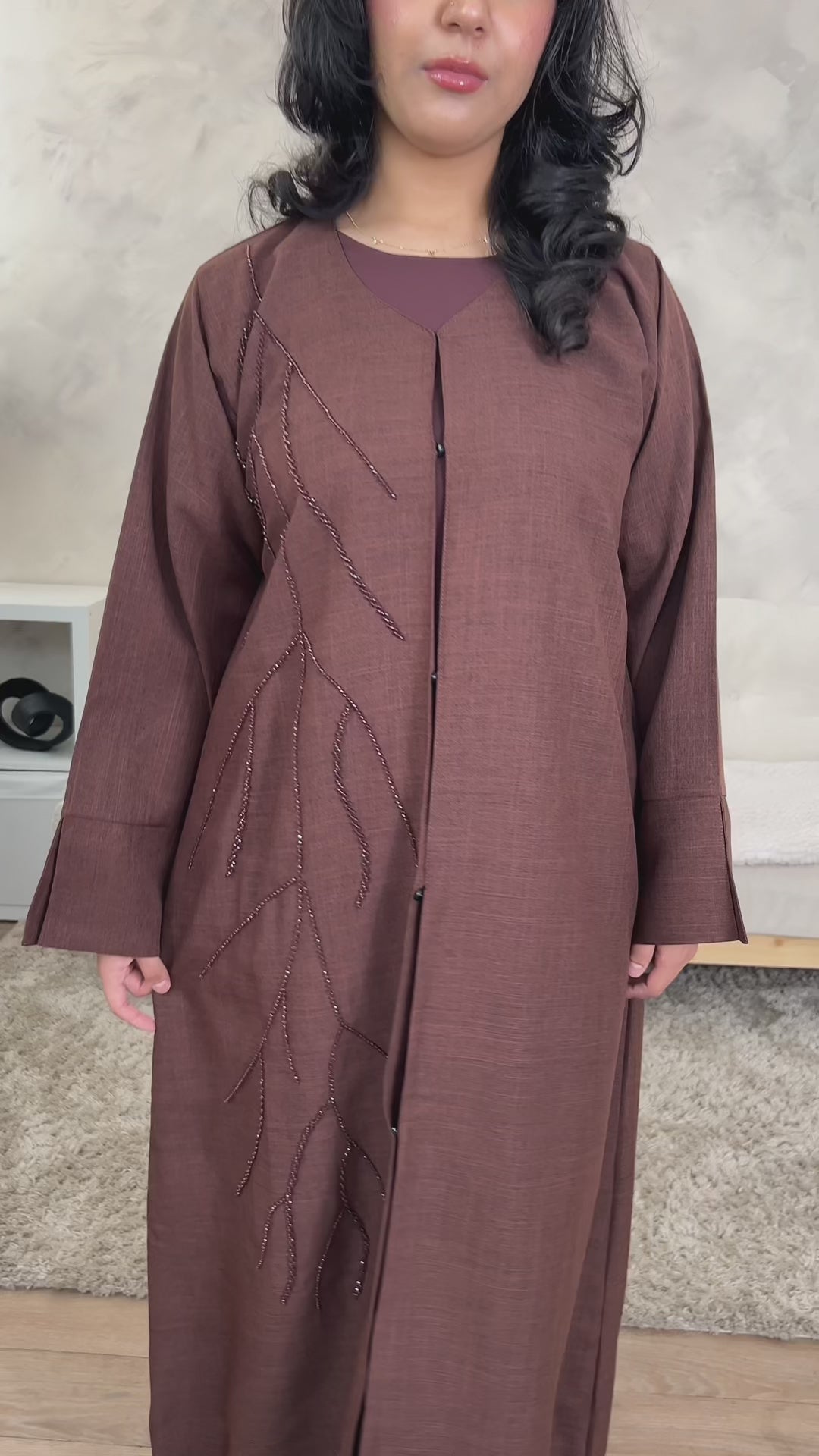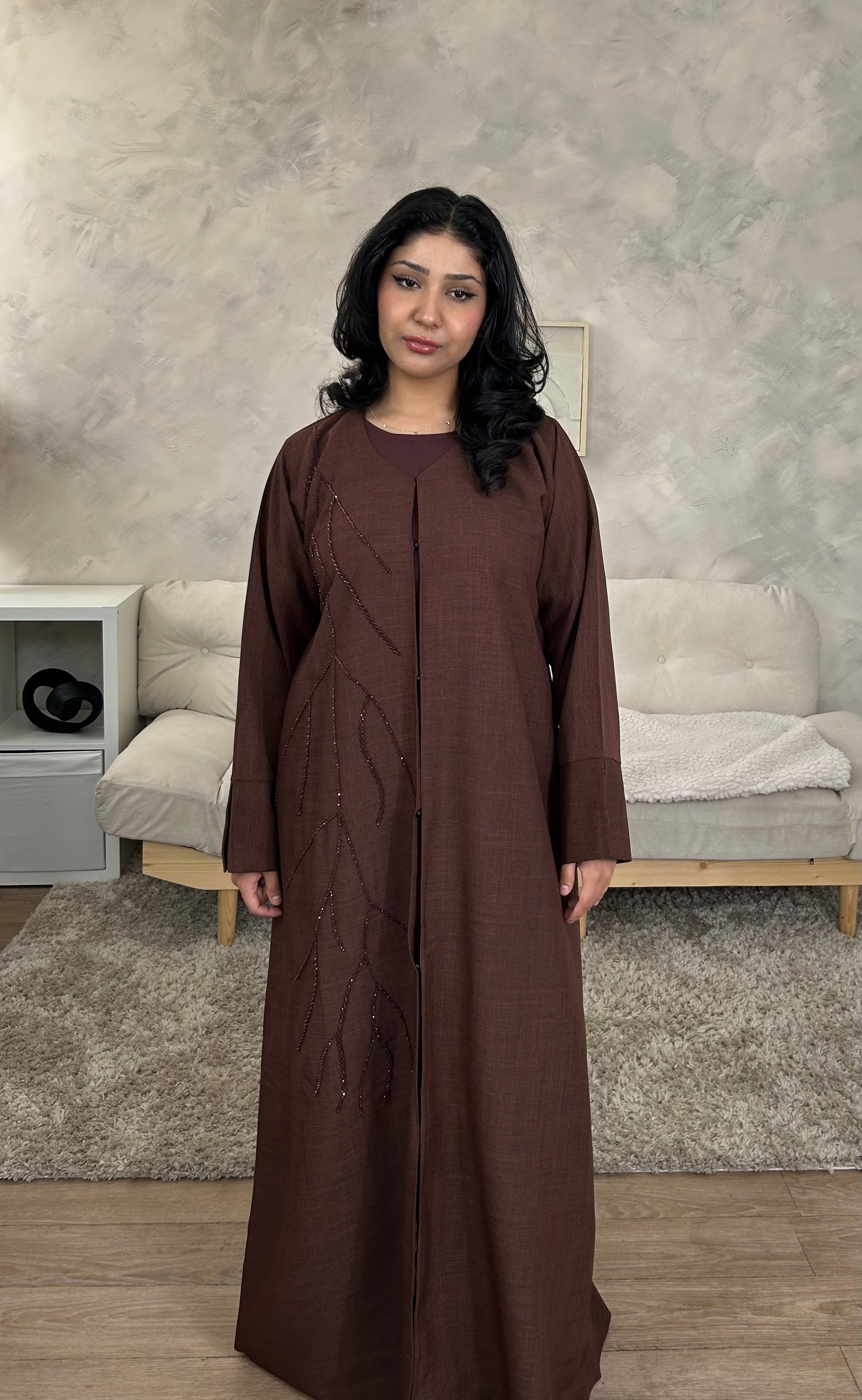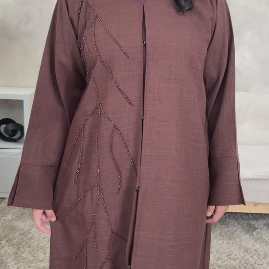 A rich chocolate brown abaya with a relaxed fit, featuring subtle beaded embroidery in an organic, branch-like design. -elegant and effortlessly modest