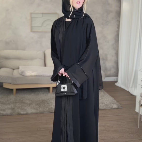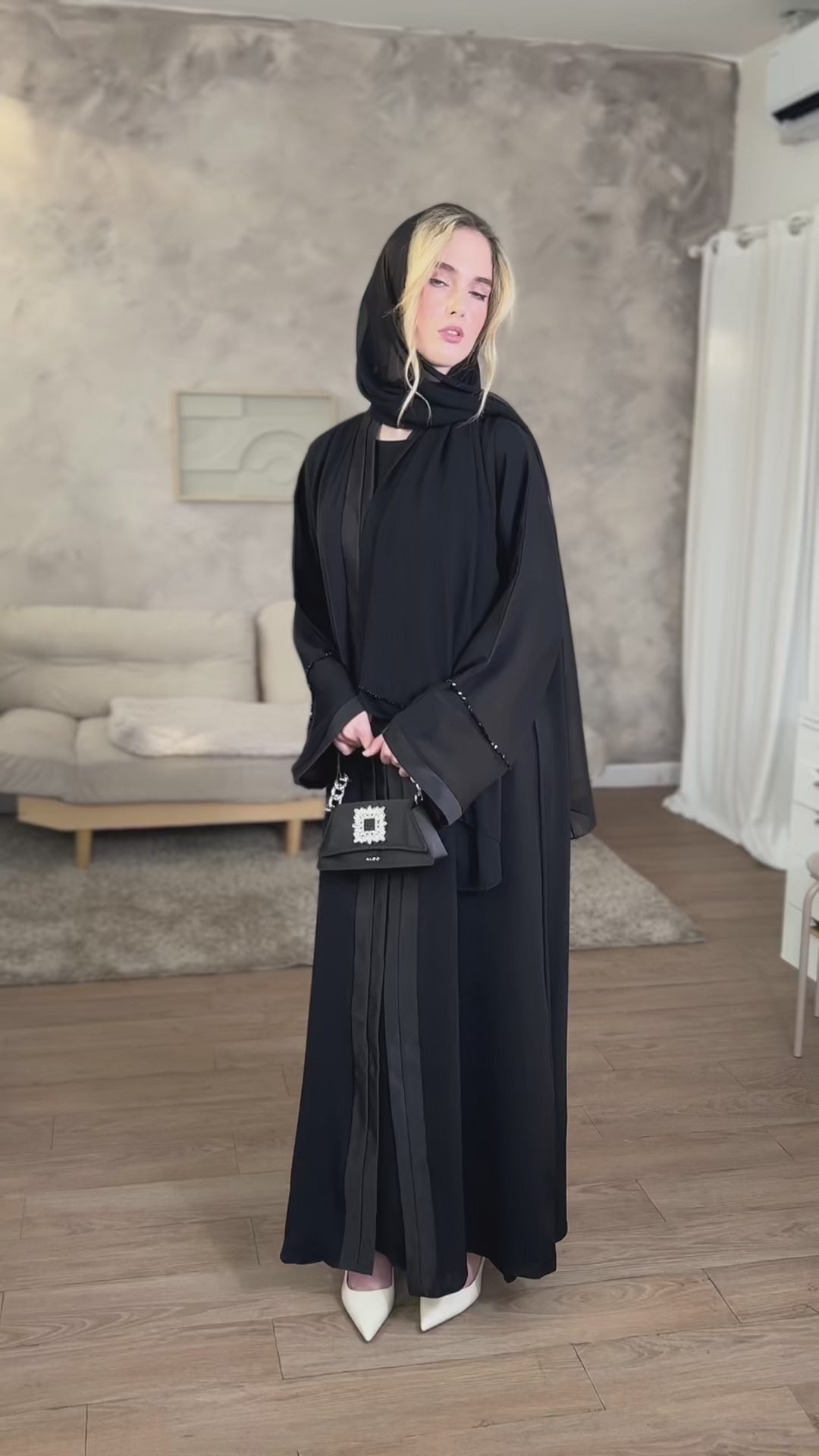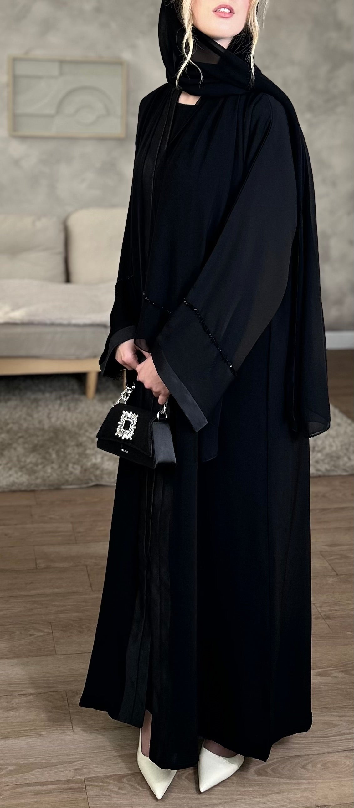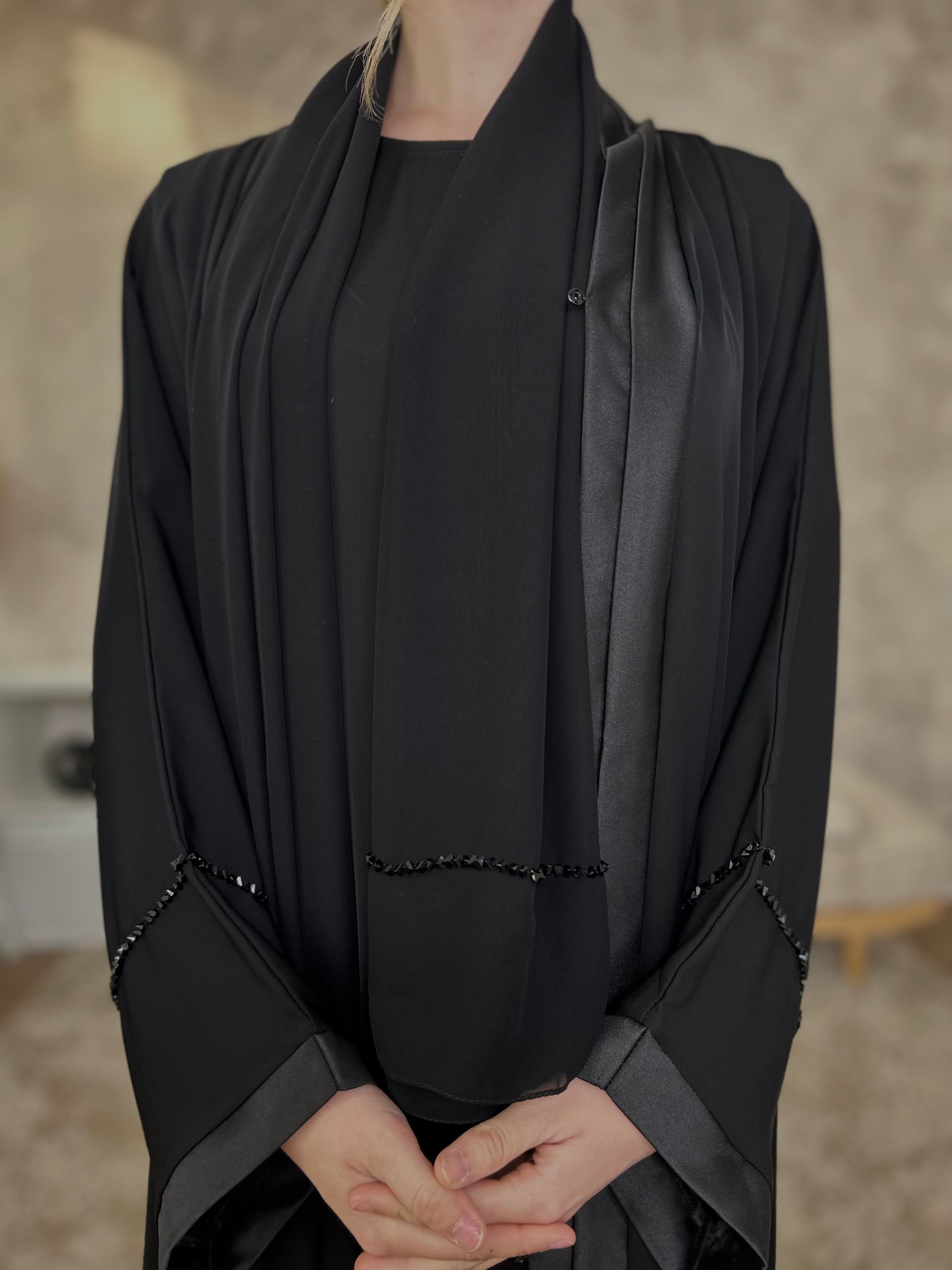 A true statement of timeless grace, the Siyah Zerafet abaya features a clean silhouette with refined satin accents and delicate sleeve detailing. Designed for women who embodies a quiet sophistication, its the essence of modern modesty and effortless style.